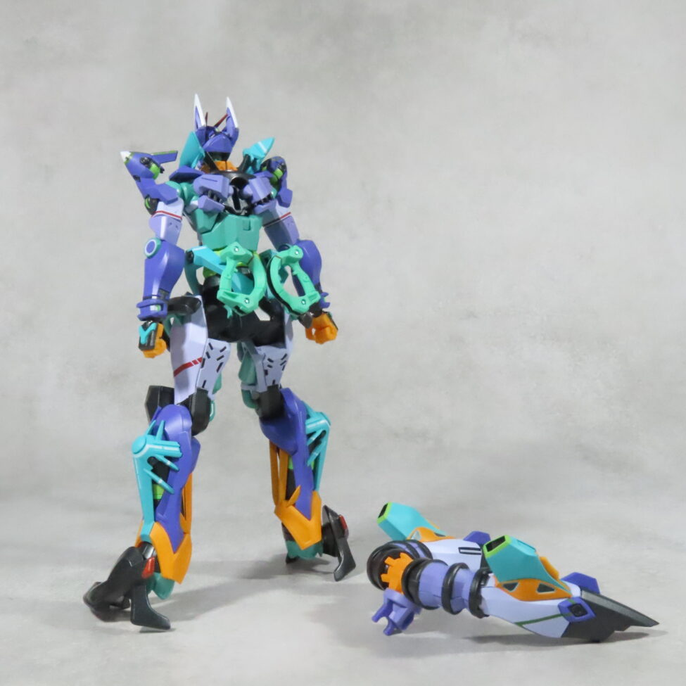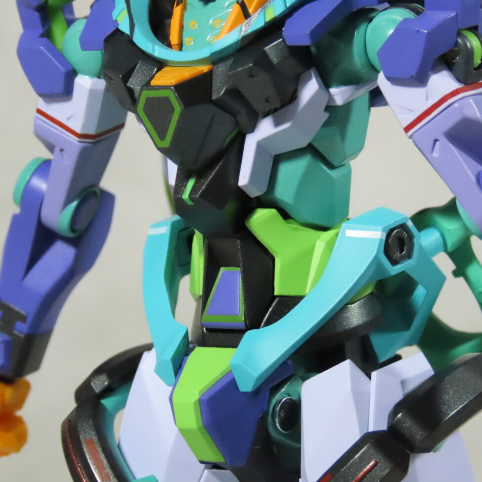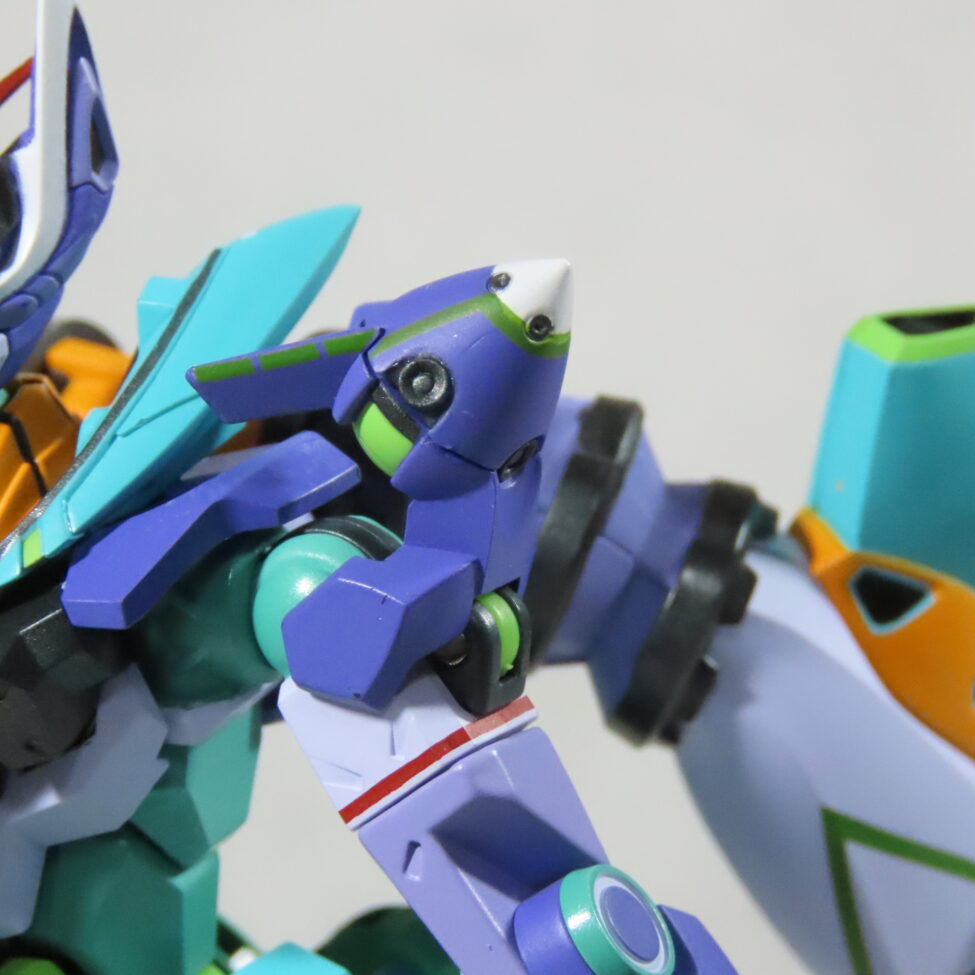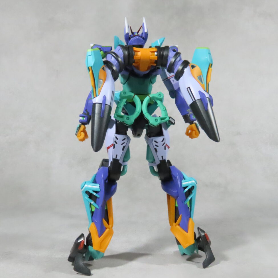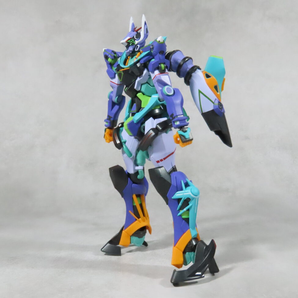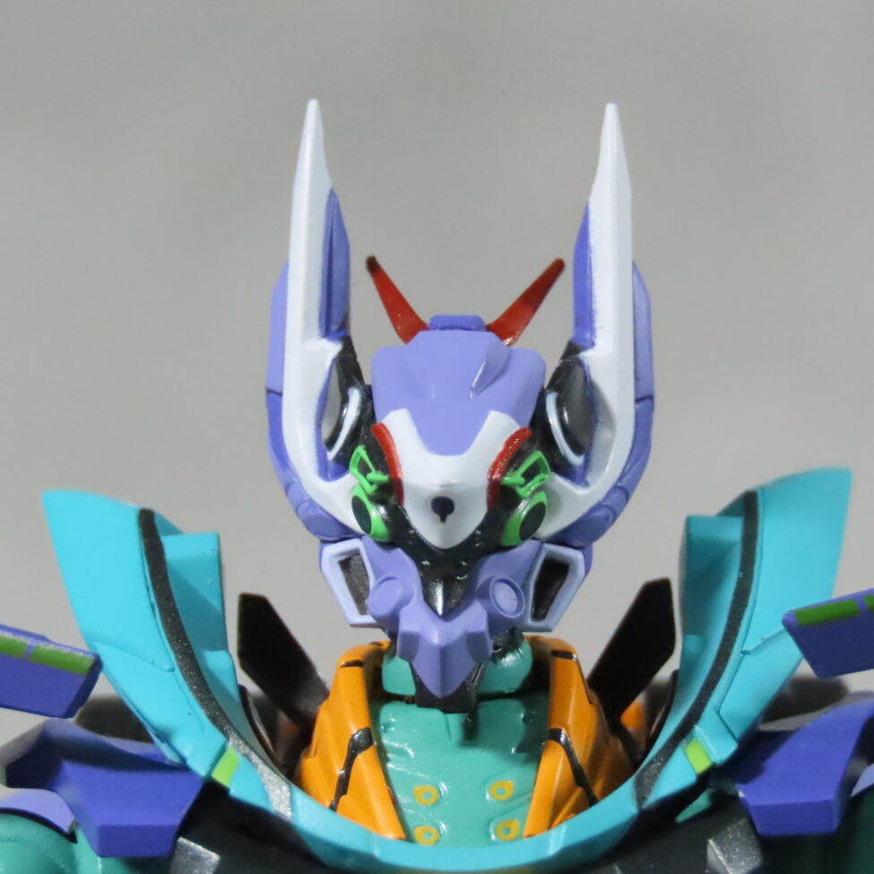 エヴァ初号機(最近メタルビルドで30周年のものがでた)の形状と似てて、紫や緑を基調としたカラーリングも影響している。