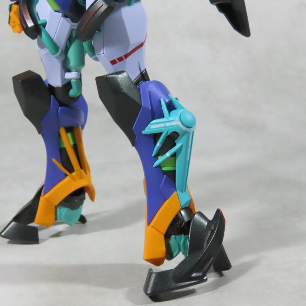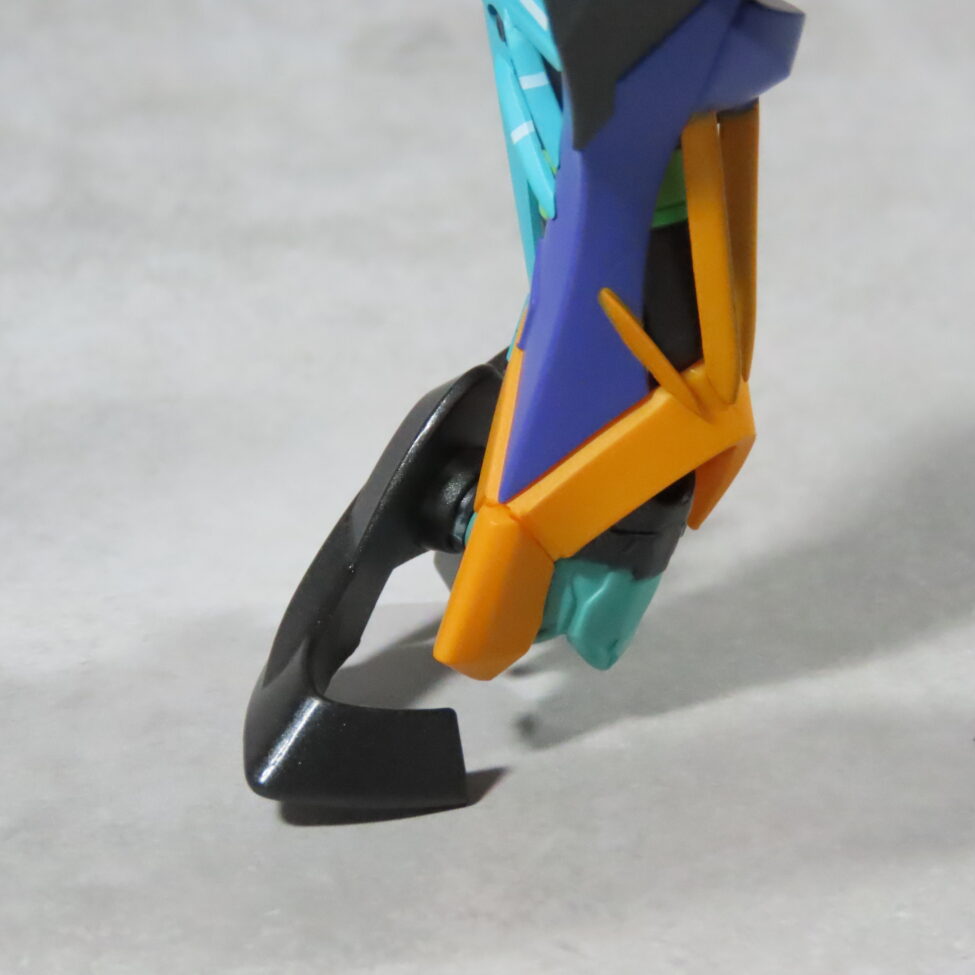 つま先の形状は、今までのモビルスーツにはない形。外側の装甲(黒い箇所)でささえるようになっています。
